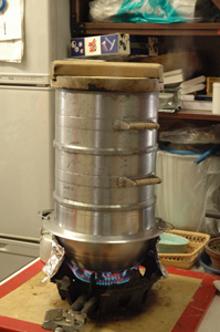 まずは年季の入った素晴らしい蒸し器にて、もち米を蒸します。