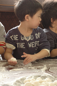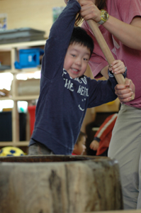 宇くんの幼稚園、森学舎に昨年から木の臼が置いてあったのでいつ使うんだろう?と思っていたら、やっと出番が。